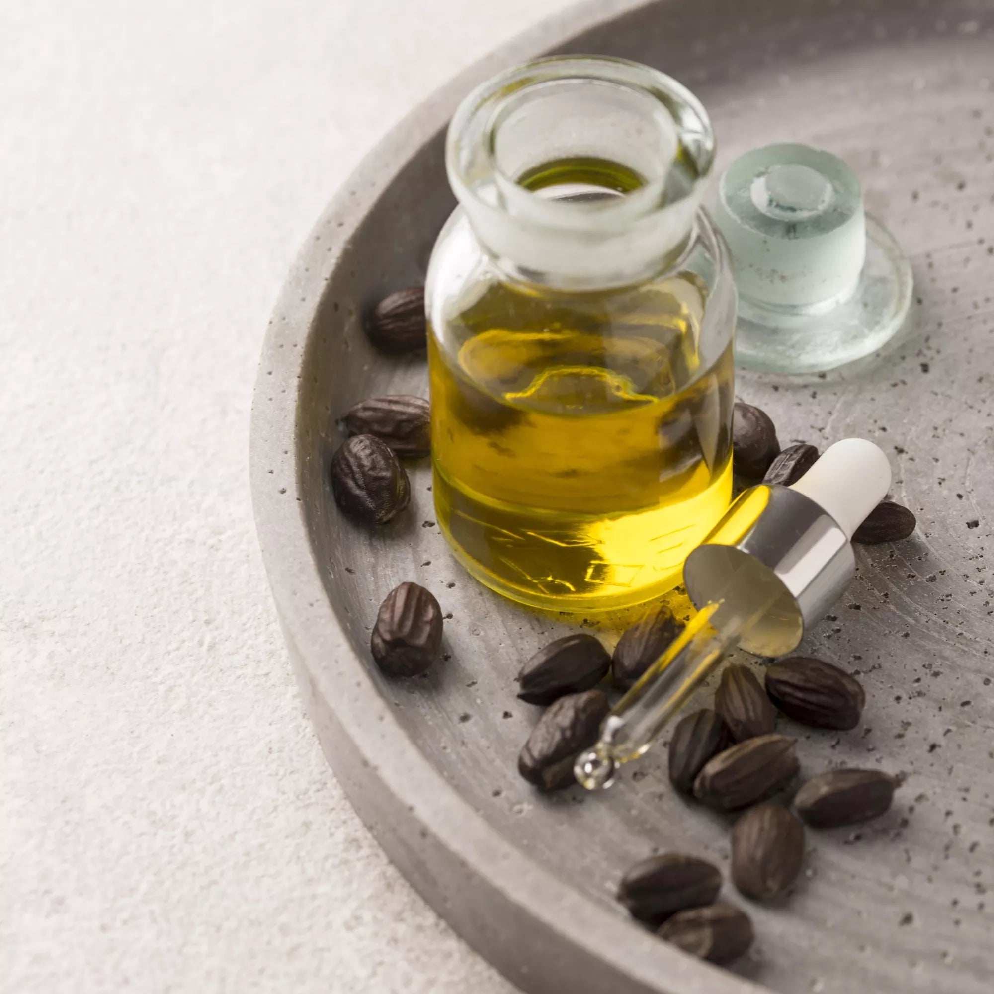 Aceite vegetal de las semillas de la planta Simmondsia chinensis. Su composición es muy similar al sebo humano, por eso se absorbe bien, no suele obstruir poros y es apto para casi todo tipo de piel. Por su composición de ésteres de cera, tipo ceramida , vitamina E, vitaminas liposolubles y ácido linoleico, tiene un efecto protector sobre piel y cabello y contribuye a su estabilidad oxidativa.